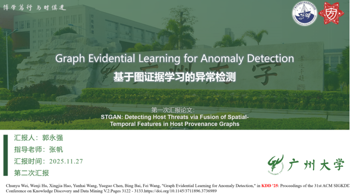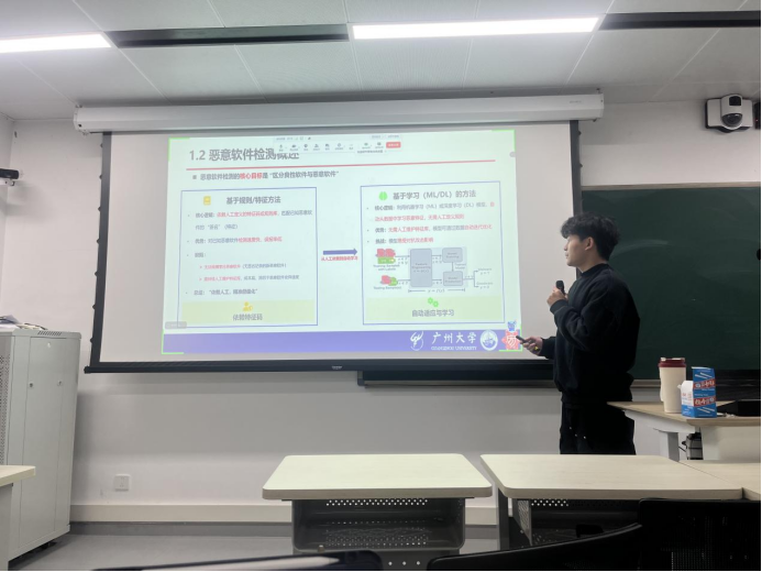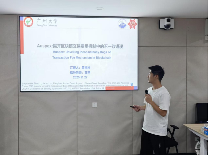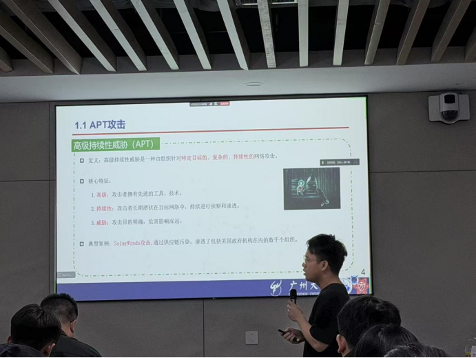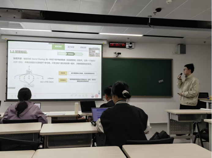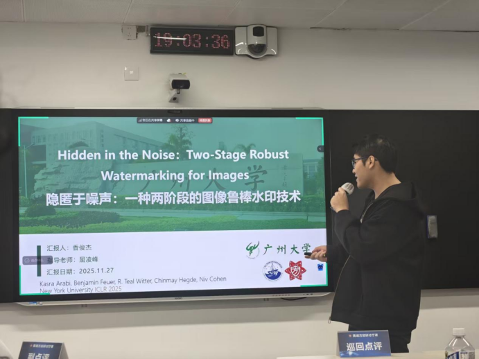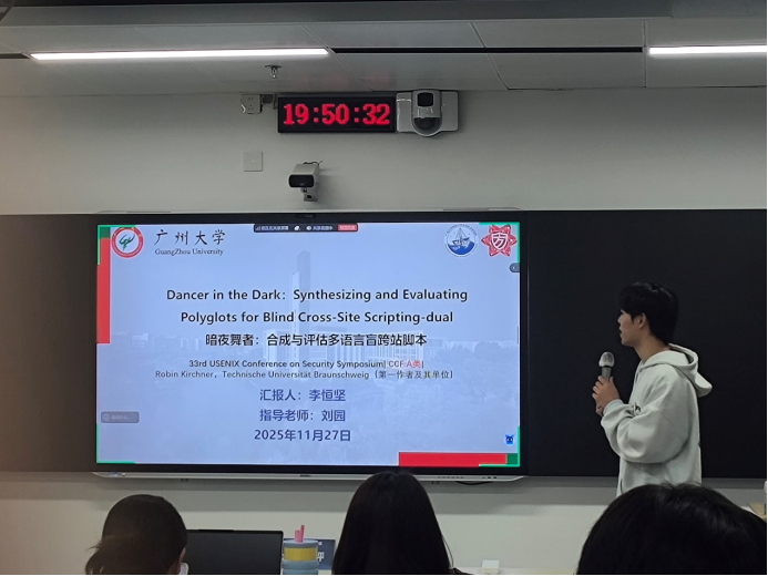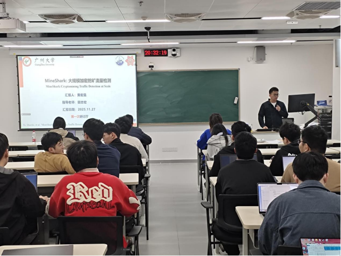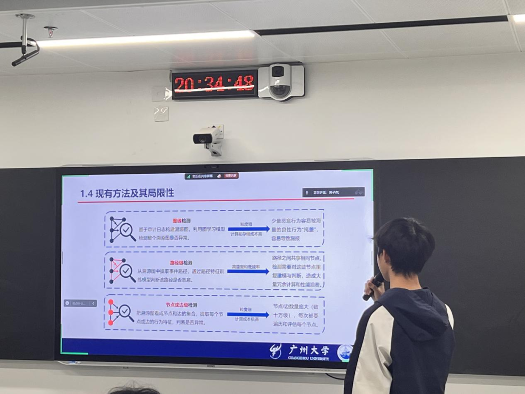 2025 年11月27日 18:00-21:30,第211期方班学术研讨厅在黄埔研究生院B2栋成功举办。广州大学网络空间安全学院名誉院长方滨兴老师,主点评张彦春老师,贾焰老师,周万雷老师,吴世忠老师,李舟军老师,黄兴忠老师,副点评陈艳利老师,吴昊天老师,唐可可老师,张帆老师,欧阳典老师,张登辉老师,张鹏老师全程参与了课堂的教学,并对同学们的报告逐一进行了指导点评。同时参与的还有网络空间安全学院的部分老师,广州大学方班八期的252名学生。