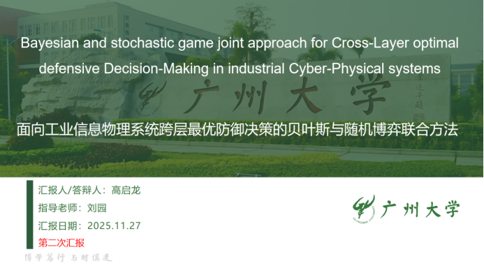 报告题目:【面向工业信息物理系统跨层最优防御决策的贝叶斯与随机博弈联合方法】