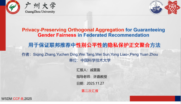 报告题目:【用于保证联邦推荐中性别公平性的隐私保护正交聚合方法】