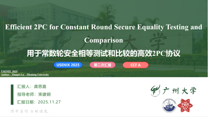 报告题目:【用于常数轮安全相等测试和比较的高效2PC协议】