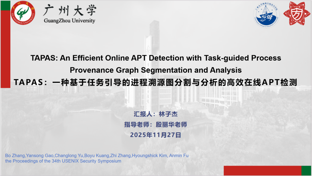 报告题目:【TAPAS:一种基于任务引导的进程溯源图分割与分析的高效在线APT检测】