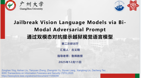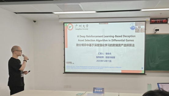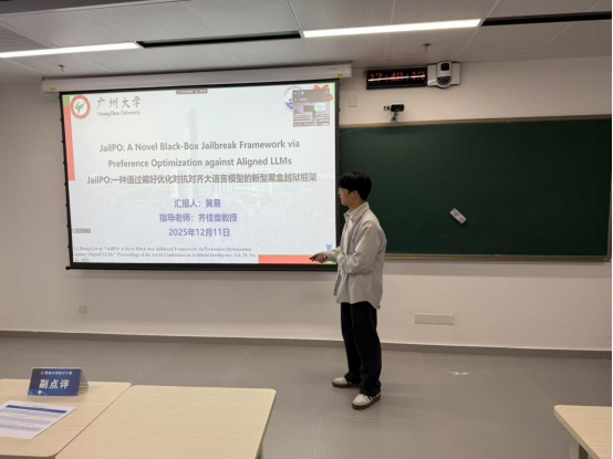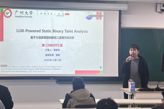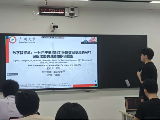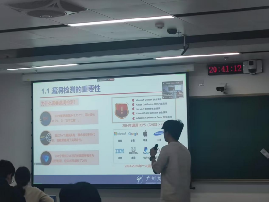 2025 年12月11日 18:00-21:30,第213期方班学术研讨厅在黄埔研究生院B2栋成功举办。广州大学网络空间安全学院名誉院长方滨兴老师,主点评张彦春老师,吴世忠老师,郭世泽老师,贾焰老师,徐贯东老师,李舟军老师;副点评陈艳利老师,吴昊天老师,唐可可老师,张帆老师,欧阳典老师,张登辉老师,张鹏老师全程参与了课堂的教学,并对同学们的报告逐一进行了指导点评。同时参与的还有网络空间安全学院的部分老师,广州大学方班八期的全体学生。