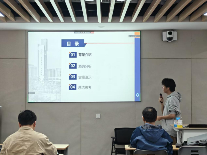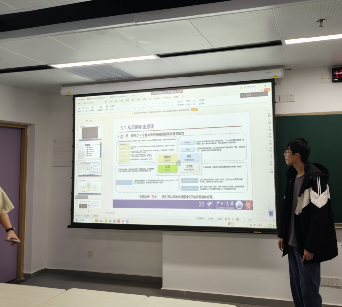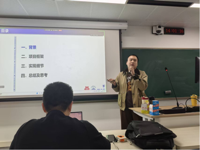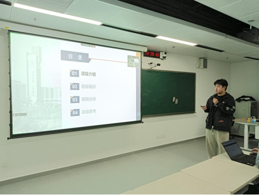 3、PPT 展示需从“讲代码”转向“讲流程”。老师们肯定了前半部分背景与框架介绍较为详实,同时指出后半段在讲实现细节时,PPT上代码与连线过多、结构略显杂乱,短时间内听众难以看懂。建议后续多用模块化流程图和简洁的框图来替代代码。