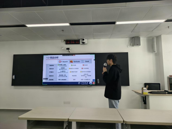 本次演武堂课程分为七个教学班。绿盟班(1班)汇报的同学是王烨、孙业铖,来自绿盟科技的邵子扬为主点评老师;海康班(2班)的汇报同学是涂家志、潘锐轩,来自海康威视的王丁磊为主点评老师;天融信班(3班)汇报的同学是李京宸、张德山,来自天融信的刘传宇为主点评老师;安天班(4班)的汇报同学是林江山、孙维政,来自安天科技的沈长伟为主点评老师;任子行班(5班)的汇报同学是谢佳宸、唐楚航,来自任子行的潘练为主点评老师;启明星辰班(6班)的汇报同学是张洺铭、张润峰,来自启明星辰的杨同磊为主点评老师;安恒班(7班)的汇报同学是马镓鸿、邓力诚,来自安恒信息技术有限公司的黄章清为主点评老师。
