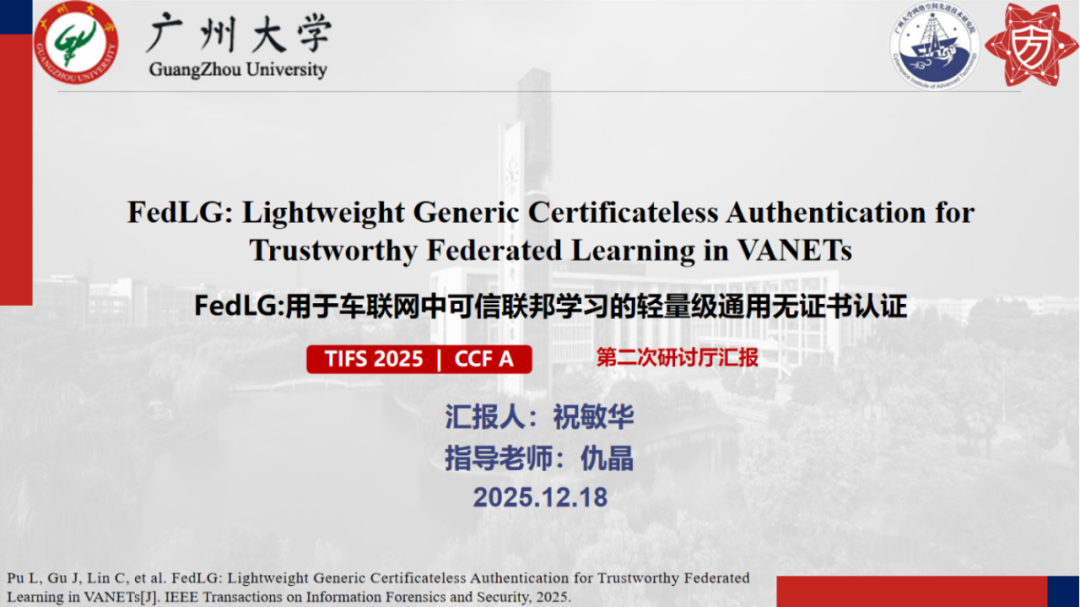 报告题目:【FedLG:用于车联网中可信联邦学习的轻量级通用无证书认证】