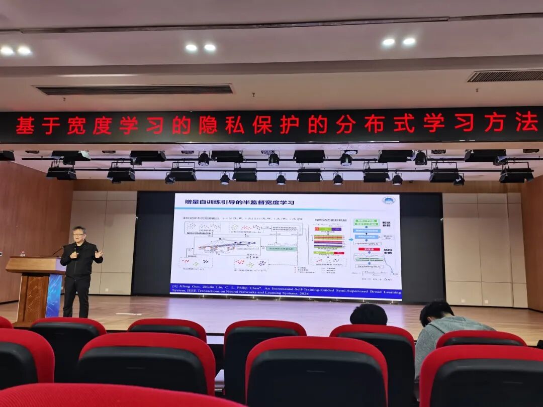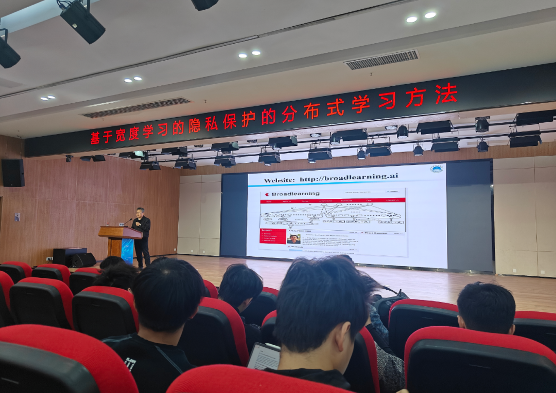 2025年12月25日,广州大学网络空间安全学院“方滨兴院士班”(方班)2025级的学子们齐聚广州大学黄埔校区B1栋109报告厅,迎来了本学期的第四十二期方班前沿秀。本次报告邀请到了国家特聘专家、华南理工大学计算机科学与工程学院院长、欧洲科学院院士陈俊龙教授作为主讲嘉宾,报告题为“基于宽度学习的隐私保护分布式学习方法”。陈教授以深厚的学术造诣与丰富的前沿案例,为同学们揭示了在隐私计算与分布式学习融合背景下,如何利用宽度学习系统打破传统深度学习的算力与通信瓶颈。