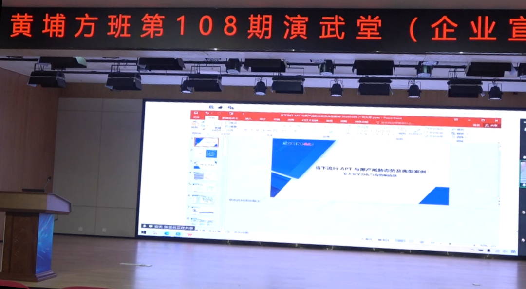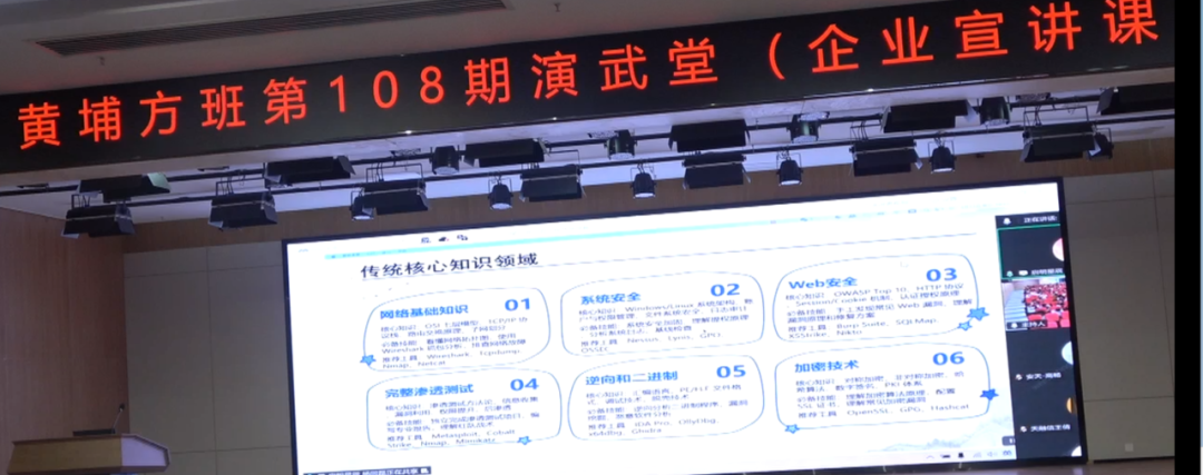2026年3月11日 14:00—17:30,黄埔方班第108期演武堂在广州大学黄埔校区B1-109顺利举行。本次活动为企业讲座专场,并同步开通腾讯会议线上参会。活动邀请了天融信科技集团股份有限公司、绿盟科技集团股份有限公司、杭州海康威视数字技术股份有限公司、北京安天网络安全技术有限公司、启明星辰信息技术集团股份有限公司、杭州安恒信息技术股份有限公司、任子行网络技术股份有限公司等企业专家开展专题分享,围绕网络安全行业发展、技术前沿、人才培养与职业规划等内容展开交流,黄埔方班全体学生参加了本次活动。