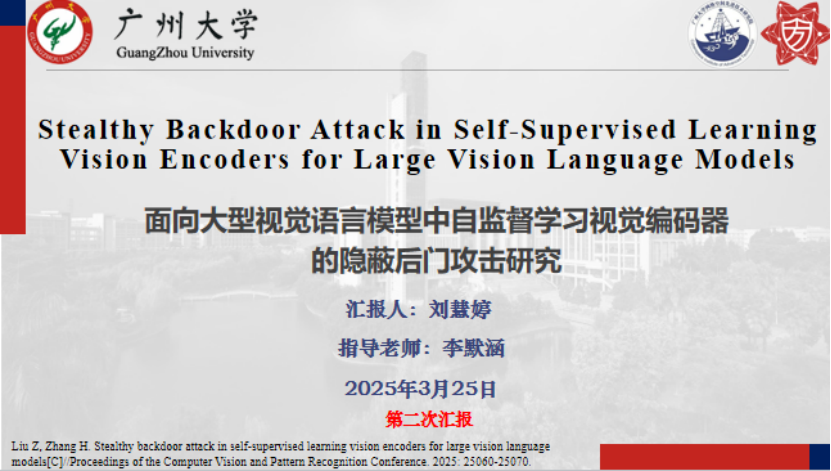 报告题目:【面向大型视觉语言模型中自监督学习视觉编码器的隐蔽后门攻击研究】