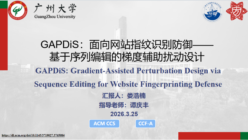 报告题目:【GAPDiS:面向网站指纹识别防御——基于序列编辑的梯度辅助扰动设计】