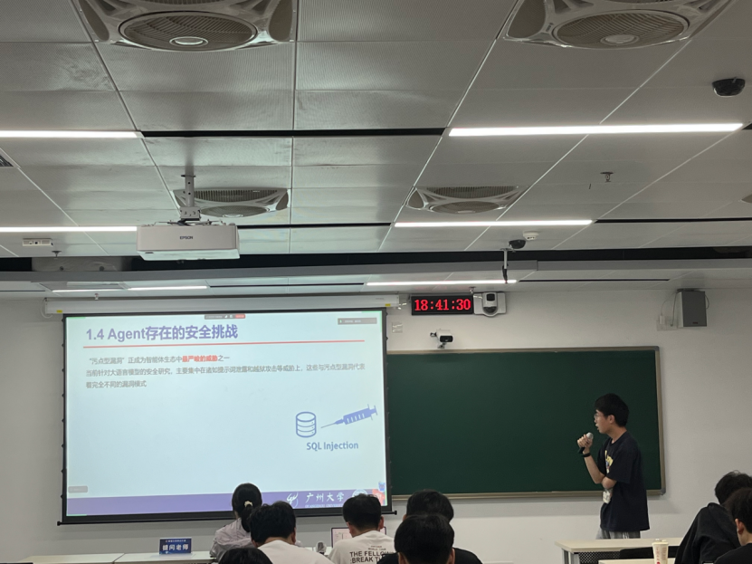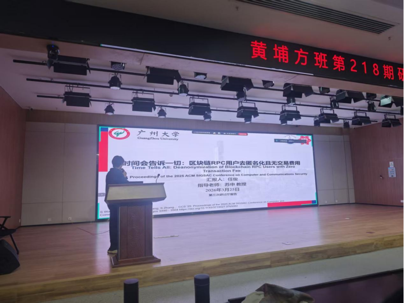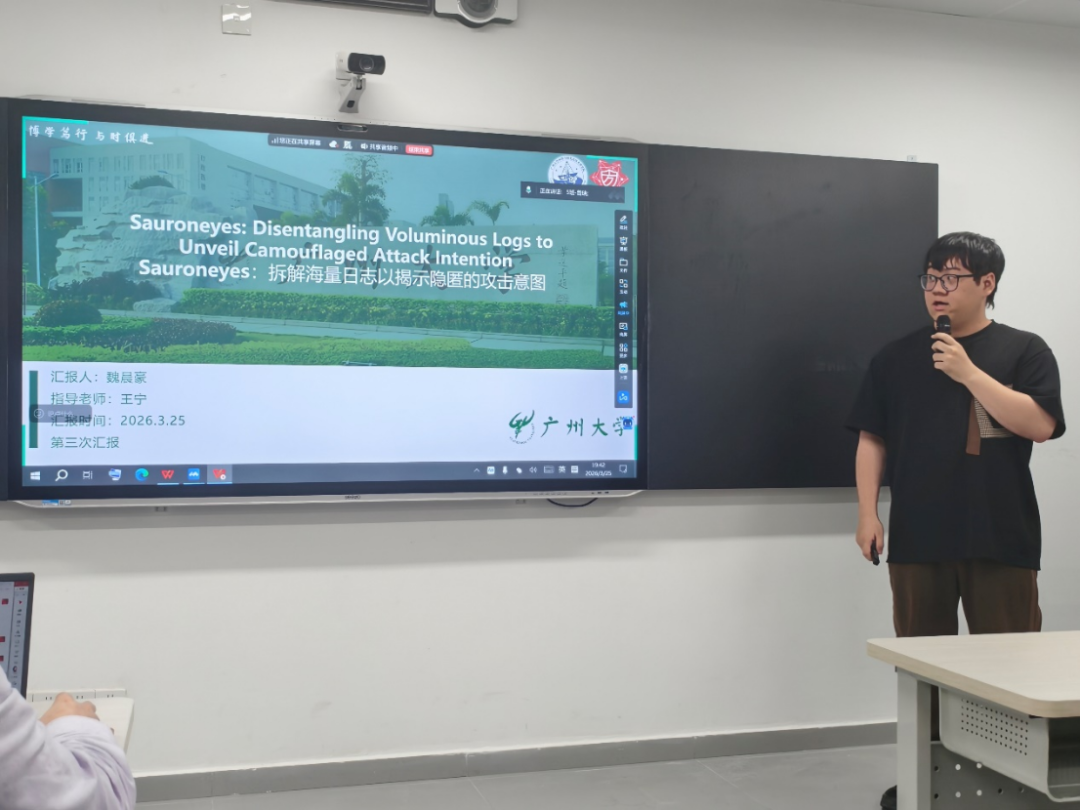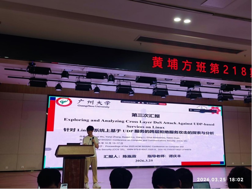 2026 年3月25日 18:00-21:30,第210期方班学术研讨厅在黄埔研究生院B2栋成功举办。广州大学网络空间安全学院名誉院长方滨兴老师,主点评贾焰老师,云晓春老师,吴世忠老师,李建新老师,史元春老师,李凤华老师,副点评陈艳利老师,吴昊天老师,唐可可老师,张帆老师,欧阳典老师,张登辉老师,张鹏老师全程参与了课堂的教学,并对同学们的报告逐一进行了指导点评。