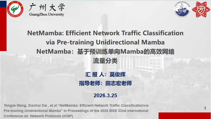 报告题目:【NetMamba:基于预训练单向Mamba的高效网络流量分类】