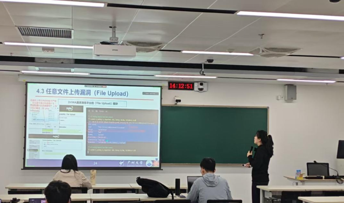 本次演武堂课程分为七个教学班。绿盟班(1班)汇报的同学是姚俊豪、王明杭、汪功铭,来自绿盟科技的李玉杰、赖智全、张玮为主点评老师;海康班(2班)的汇报同学是杭微、卢芳、李洪元,来自海康威视的李超豪、王玉银为主点评老师;天融信班(3班)汇报的同学是鹿艺潇、张泳文,来自天融信的孙李坤、李泉为主点评老师;安天班(4班)的汇报同学是郑斌、孙善辉、焦雅琦,来自安天科技的李林哲、王耀华为主点评老师;任子行班(5班)的汇报同学是陈景超、游俊爽、陈家豪,来自任子行的彭伙林、潘晓为主点评老师;启明星辰班(6班)的汇报同学是肖祥旗、范仲钧、刘婷玉,来自启明星辰的周瑜、刘洋、陈峰为主点评老师;安恒班(7班)的汇报同学是王昕翔、罗志松、郑仕榕,来自安恒的刘美辰、丁莹、陈凯为主点评老师。
