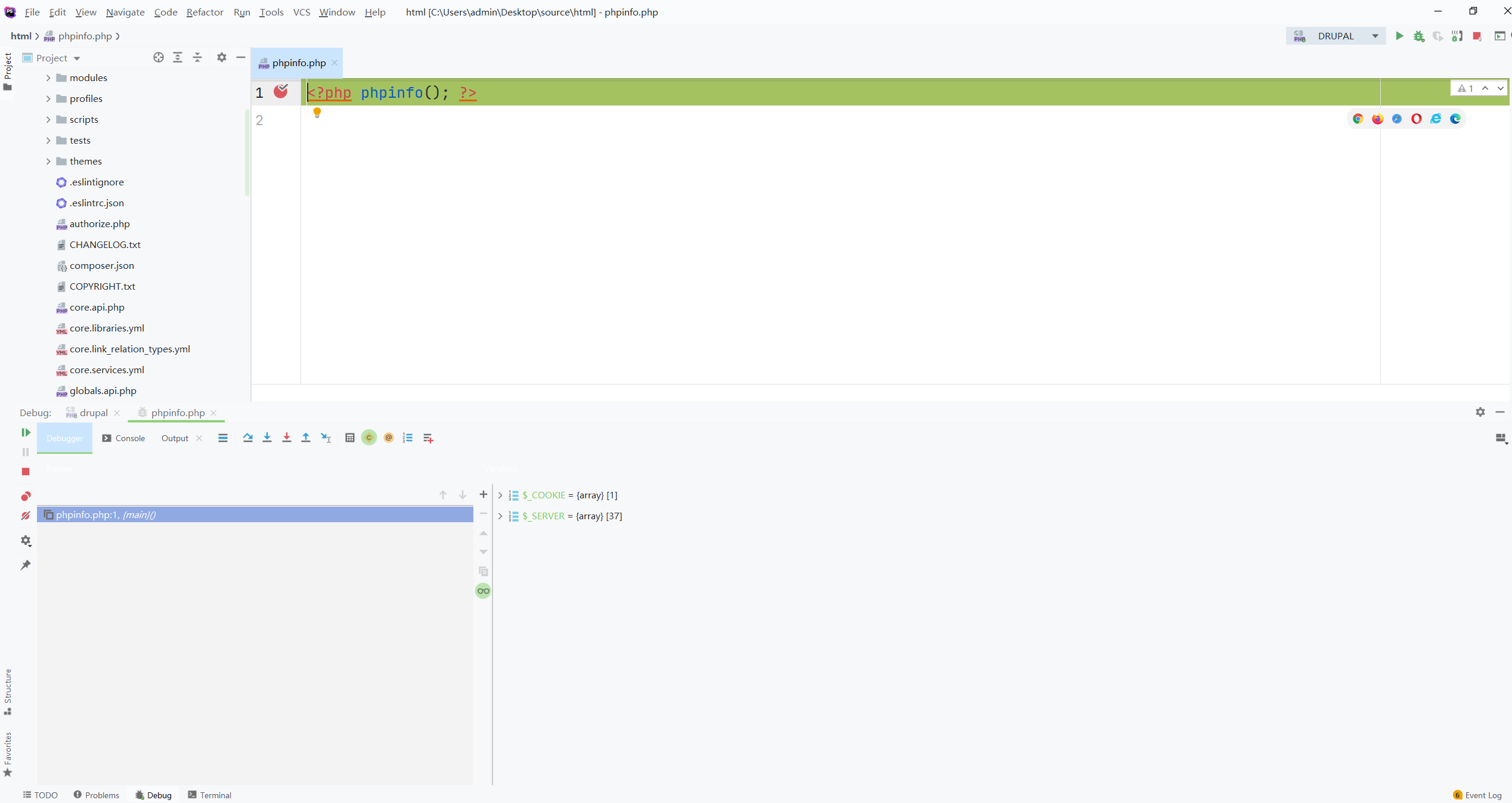 之前也配置过 PHP 的远程调试环境,但是在 Docker 里面调试的时候,配置了很久的调试环境,最后才成功,中间出了大大小小无数的问题,遇到的最大的问题是最开始端口一直显示被占用状态,因为我启动 docker 时的命令是 docker run -itd -p 80:80 -p 9001:9001 vulfocus/drupal-cve_2017_6920:latest 我一直认为说这个 9001 端口也要对外映射出来,但是我在调试时发现一直提示端口被占用,百思不得其解,采用百度大法看到了这么一句 不要在docker-compose 中添加 9000 端口 ,我灵机一动,将 -p 9001:9001 给删除掉,就成功了。这下我才完全理解了,原来这个端口是远程调控,就是安装 PHPSTORM 机器上的端口。
