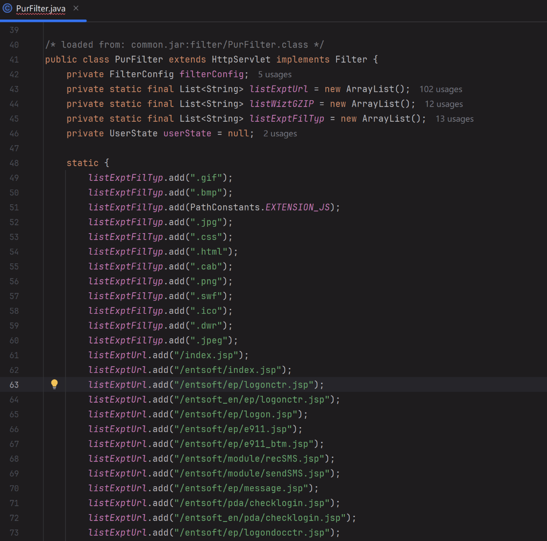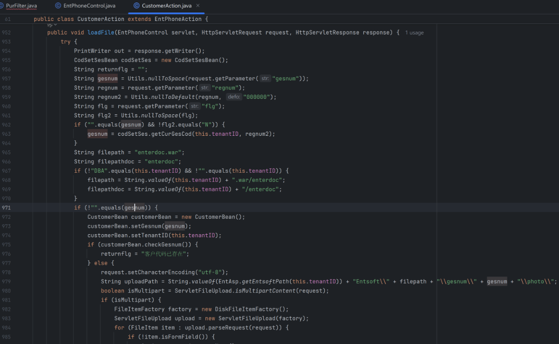 而且该系统是tomcat容器,基于该容器对;的解析特性,不会匹配到;后面的内容,也就是在进行路由匹配时,只会匹配到CustomerAction.entphone,从而使得CustomerAction.entphone;.js?method=loadFile顺利进入过滤器层面的校验,并且此时获取的后缀又是.js,处于白名单后缀,从而实现权限绕过。