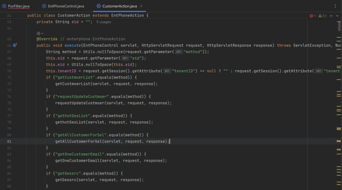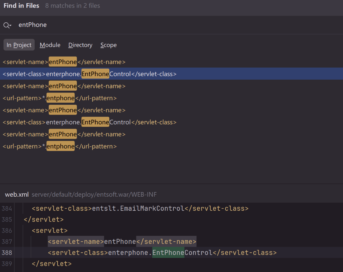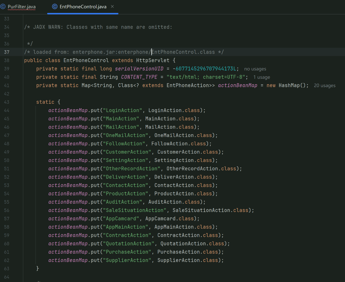 先在xml文件寻找接口对应后端代码,该接口匹配后缀.entphone,对应代码为:enterphone.EntPhoneControl类。