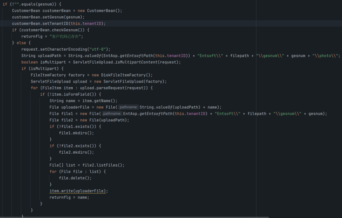 这一步是关键:若checkGesnum()方法在gesnum为null时返回false(即认为"客户代码不存在",符合业务逻辑,因为null通常不是有效的客户代码),则会进入else分支,执行文件上传逻辑。